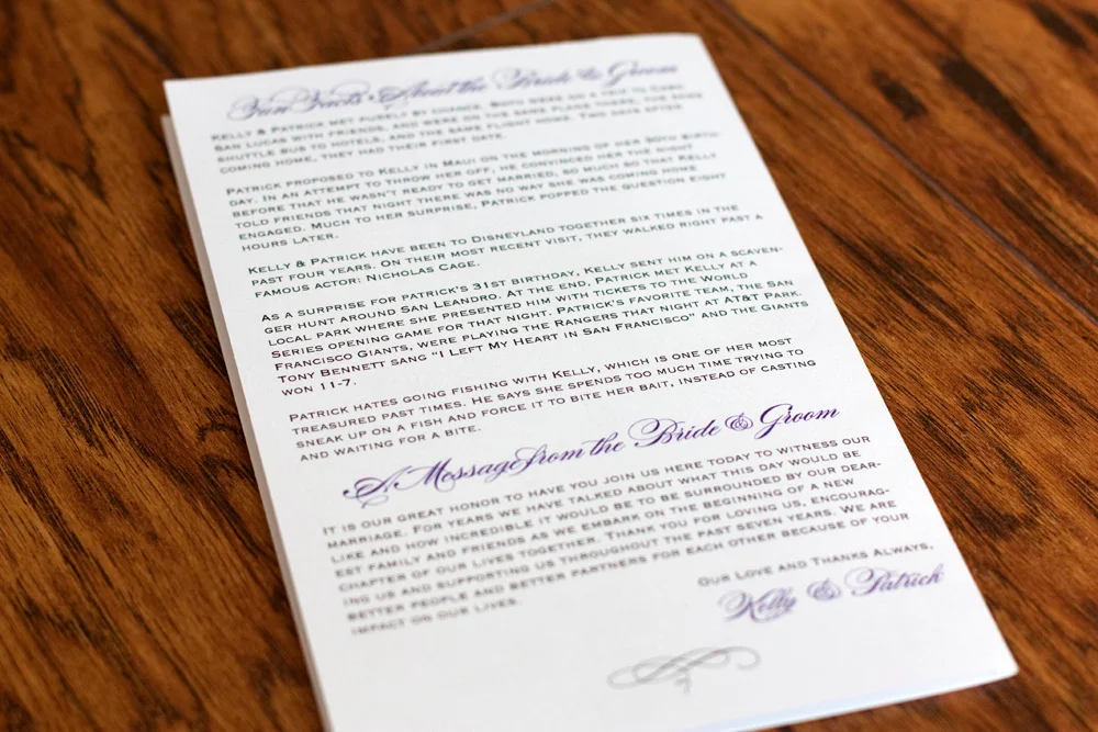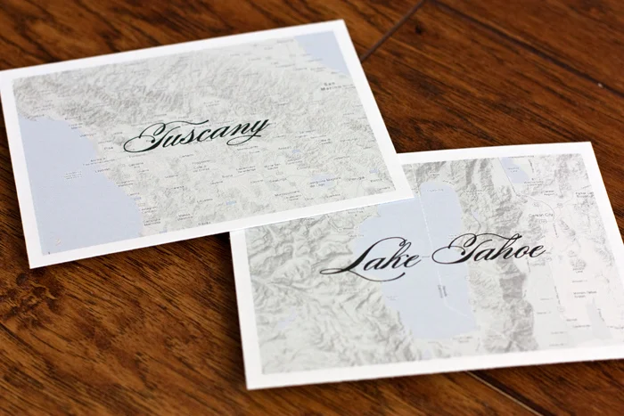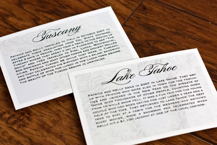 Each table was named after a place that Kelly and Patrick had visited when they were dating. The back of each card told a little story about each trip.