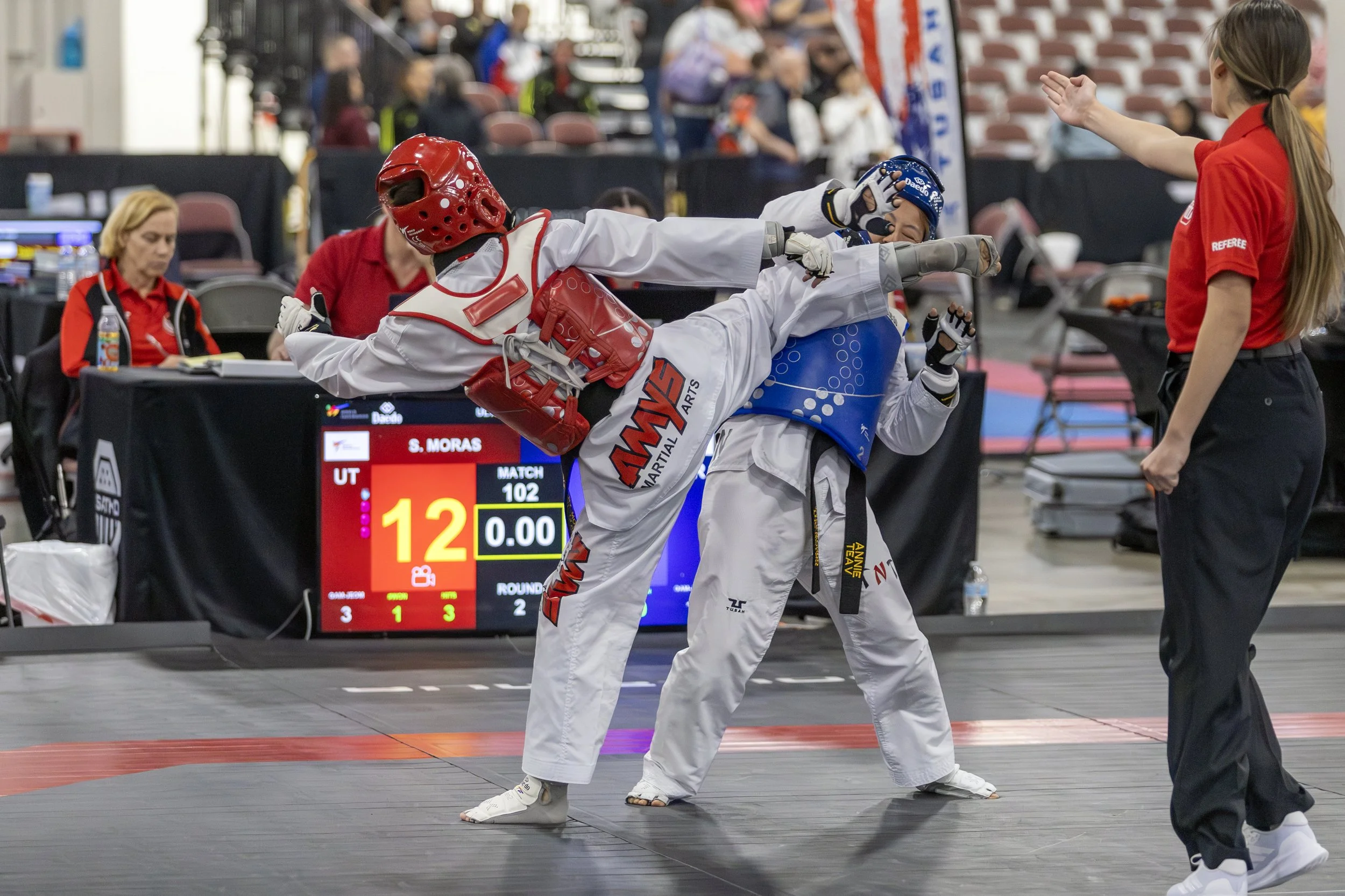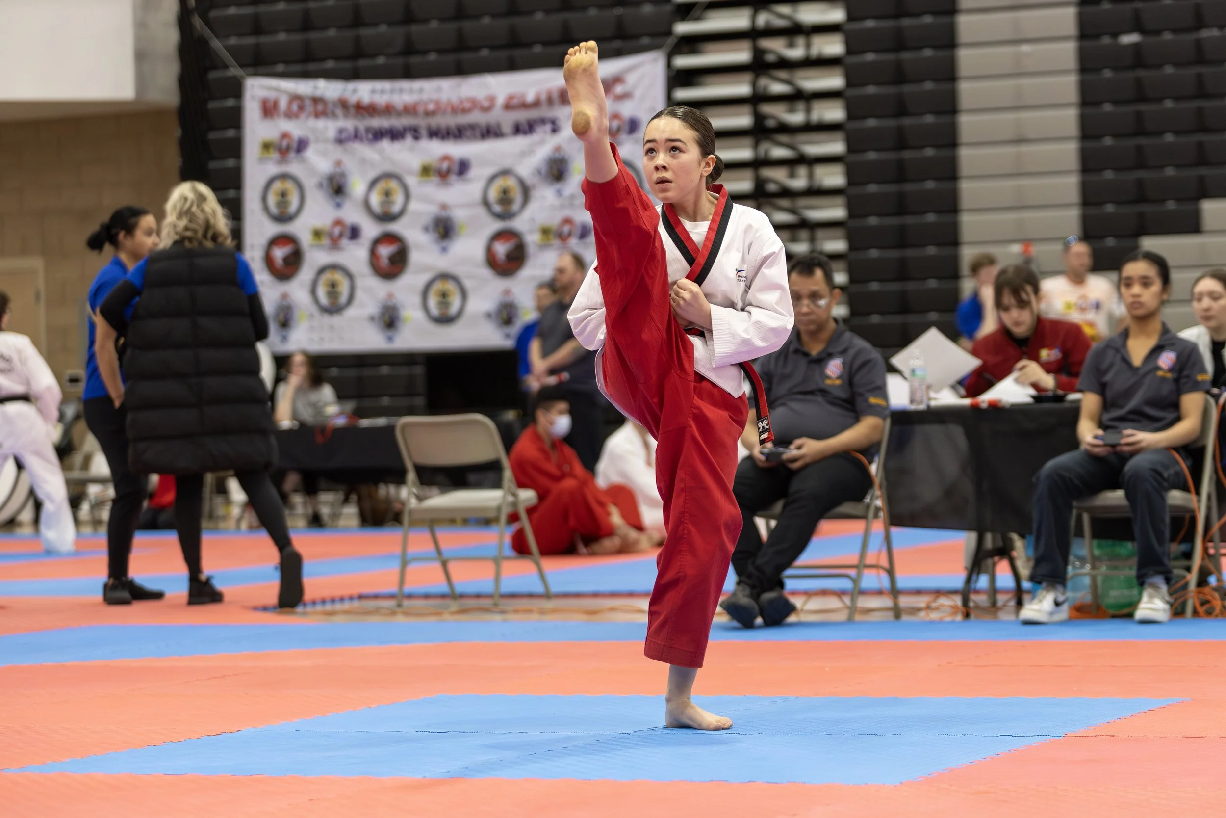 The image above is of Master Samery Moras sparring (and winning!) at the USATKD American West tournament. I got some awesome shots of her in this match. The image below is of our student Ayuna competing in poomsae at the AAU State Championship. Her front kicks are so pretty!