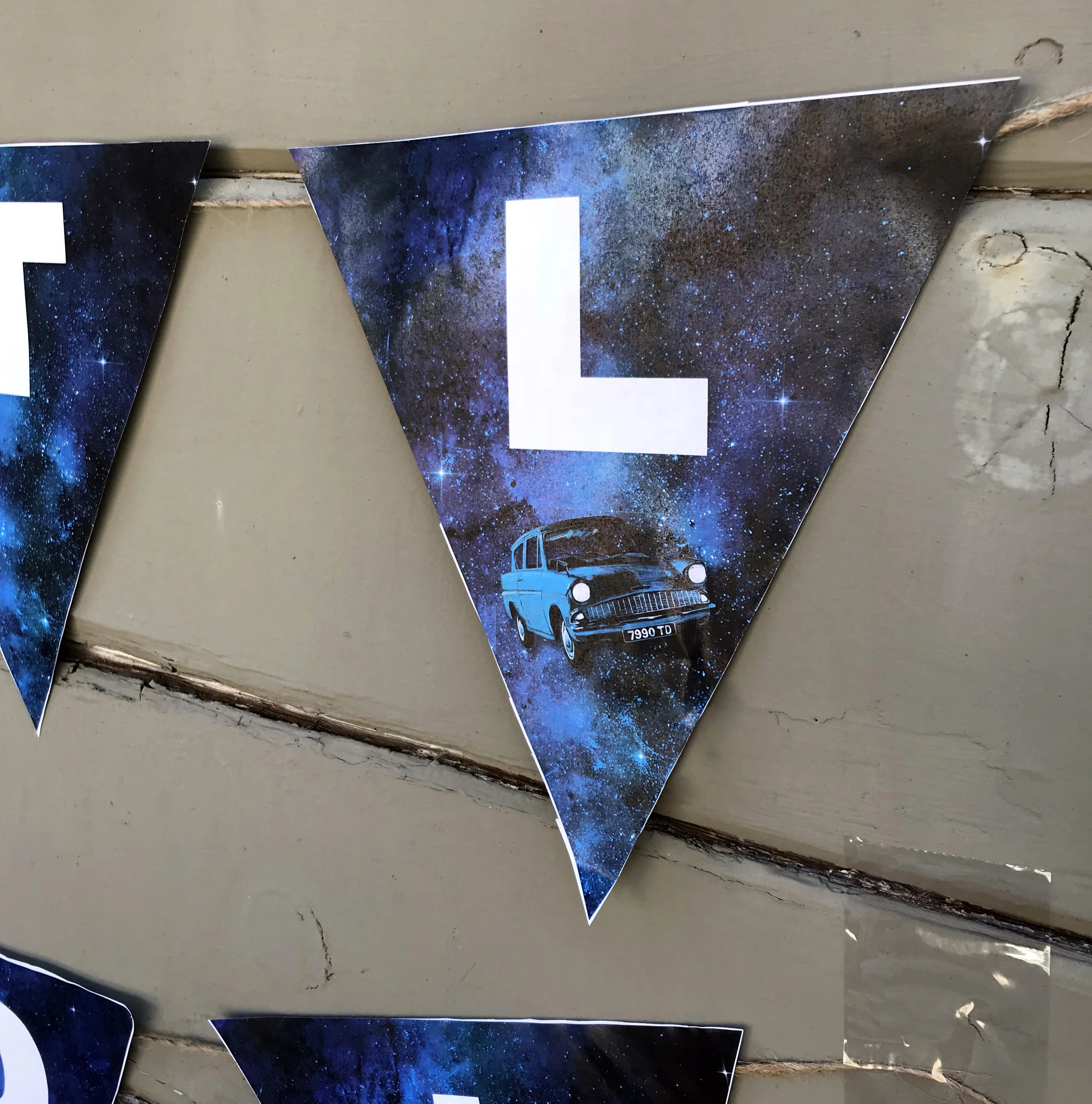 Some of the pennants had elements from the themes. This one had the Ford Anglia from Harry Potter. One also had Dr. Who’s Tardis, and others had a Millennium Falcon and an Tie fighter from Star Wars.