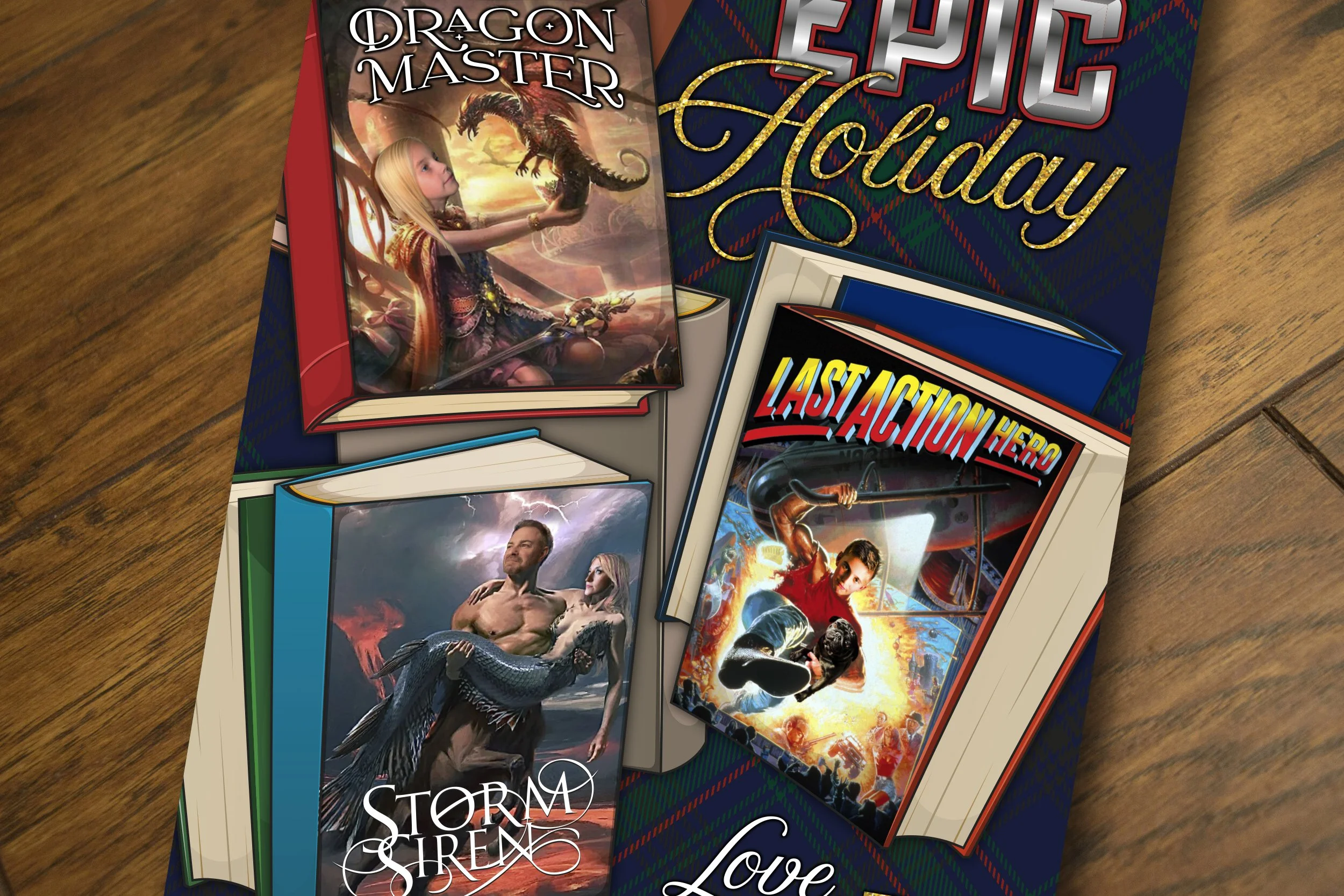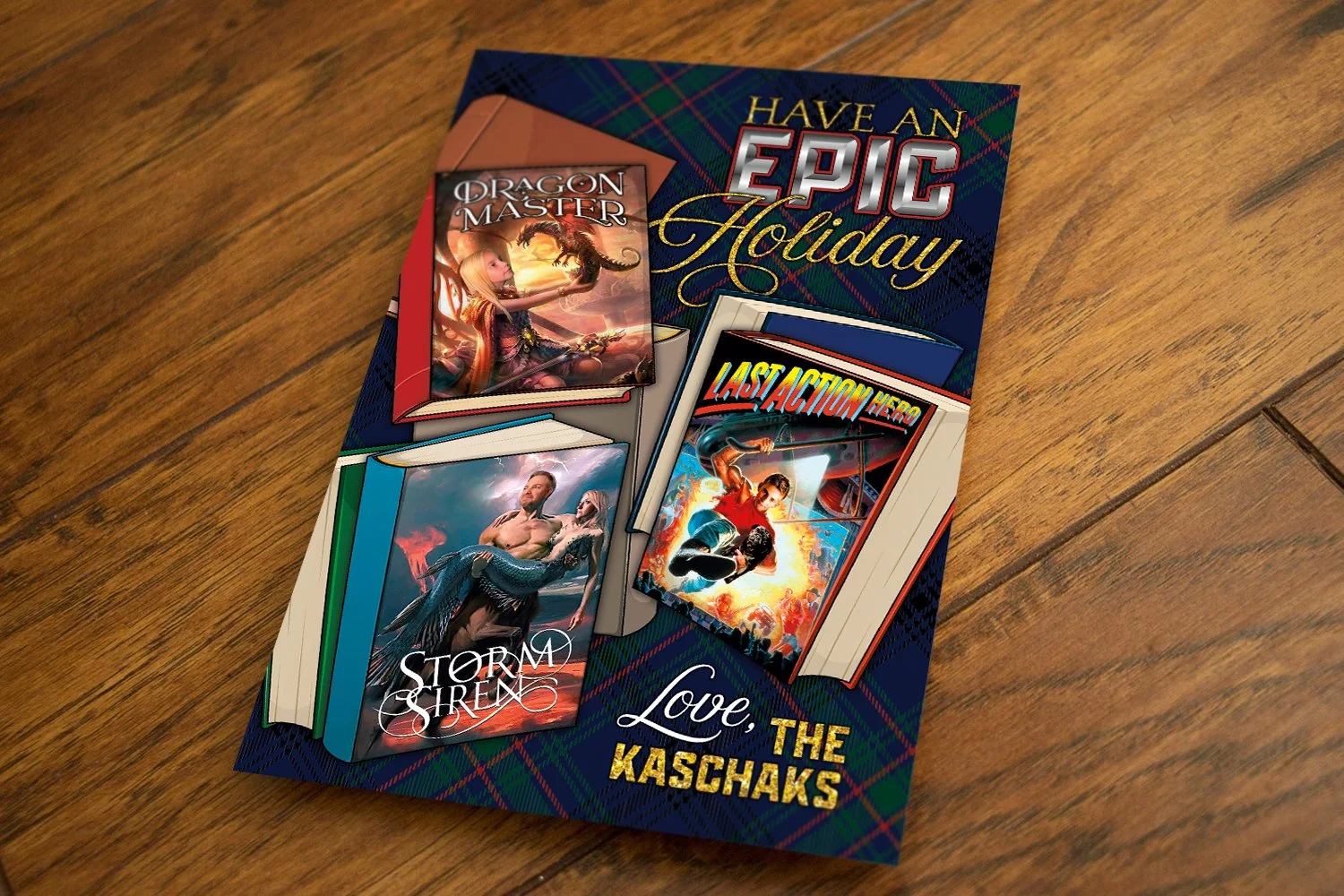 This year Laura had fun with Photoshop and some fun, fake book cover ideas. I helped out with some Photoshop too; especially getting her son’s head and their pug, Mr Bean into the Last Action Hero poster and coming up with the book type. I also threw together the plaid background and the actual books that each cover is part of. This was SO much fun to work on!!