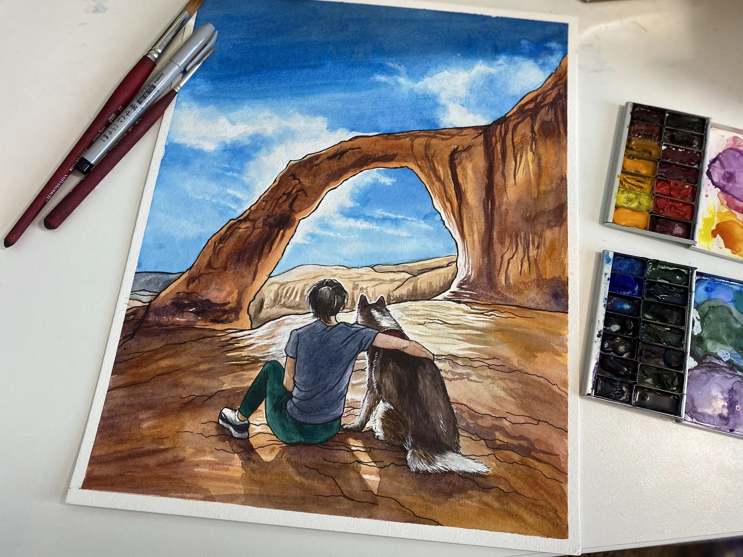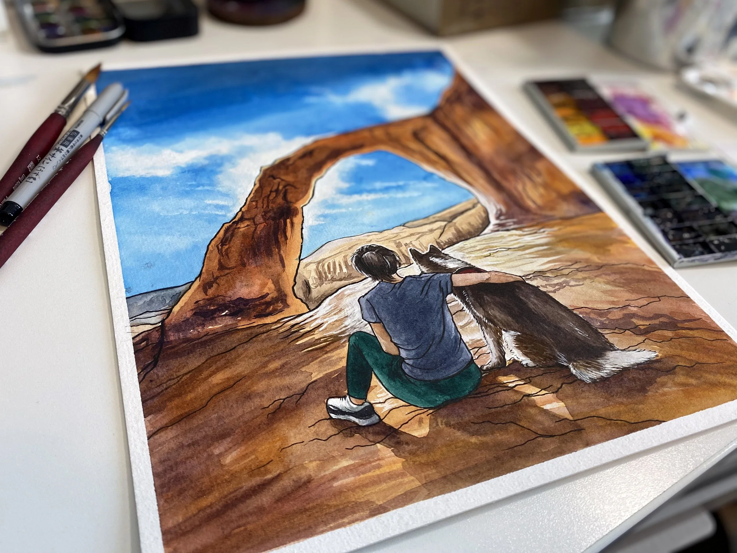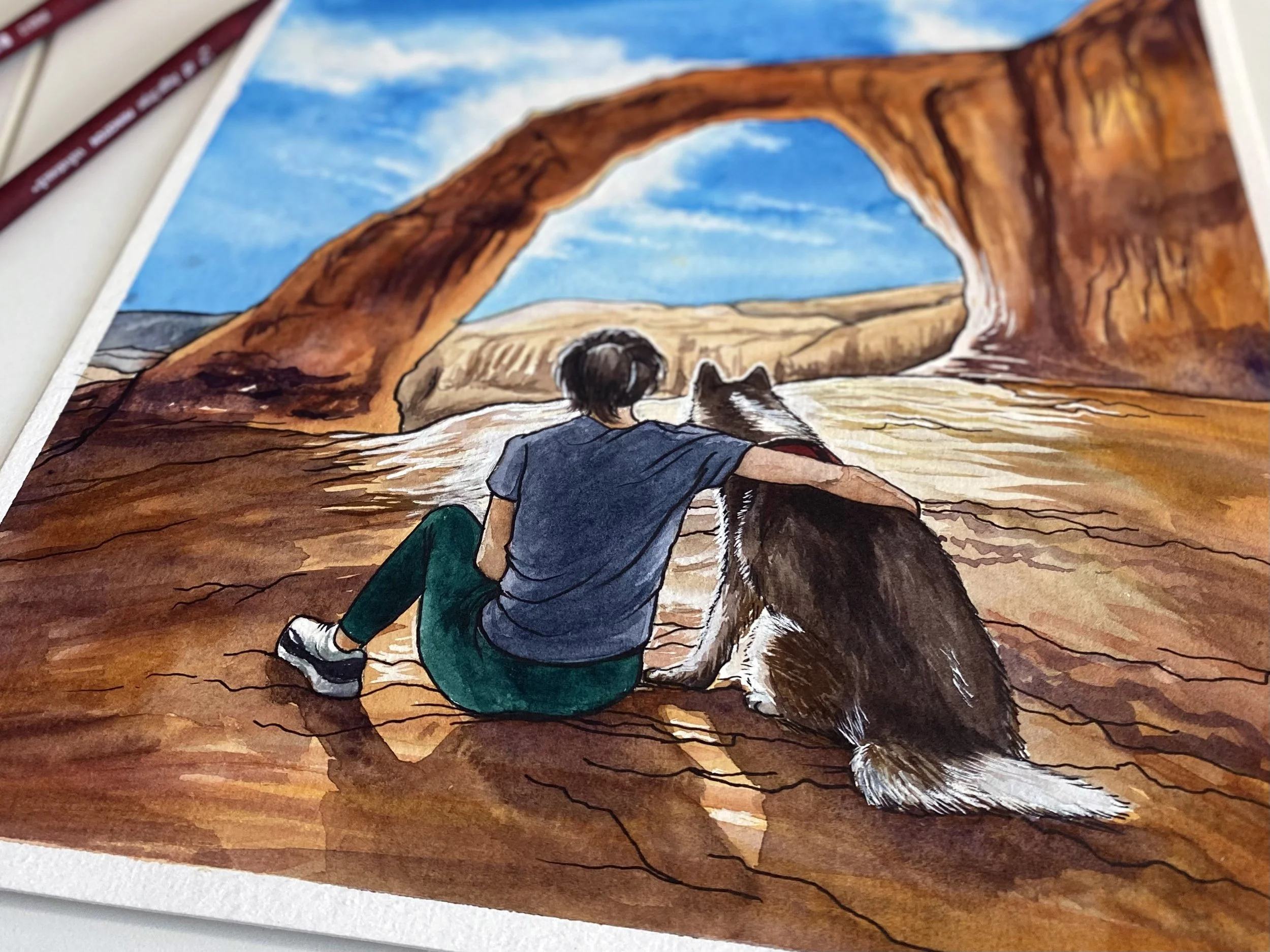 My friend and taekwondo master Samery asked me if I’d recreate this photo of her with her husky, Leo in watercolor and I was more than thrilled to do it for her. Corona Arch is one of my favorite hikes in the Moab, UT area as is apparent with how many times I’ve painted it.