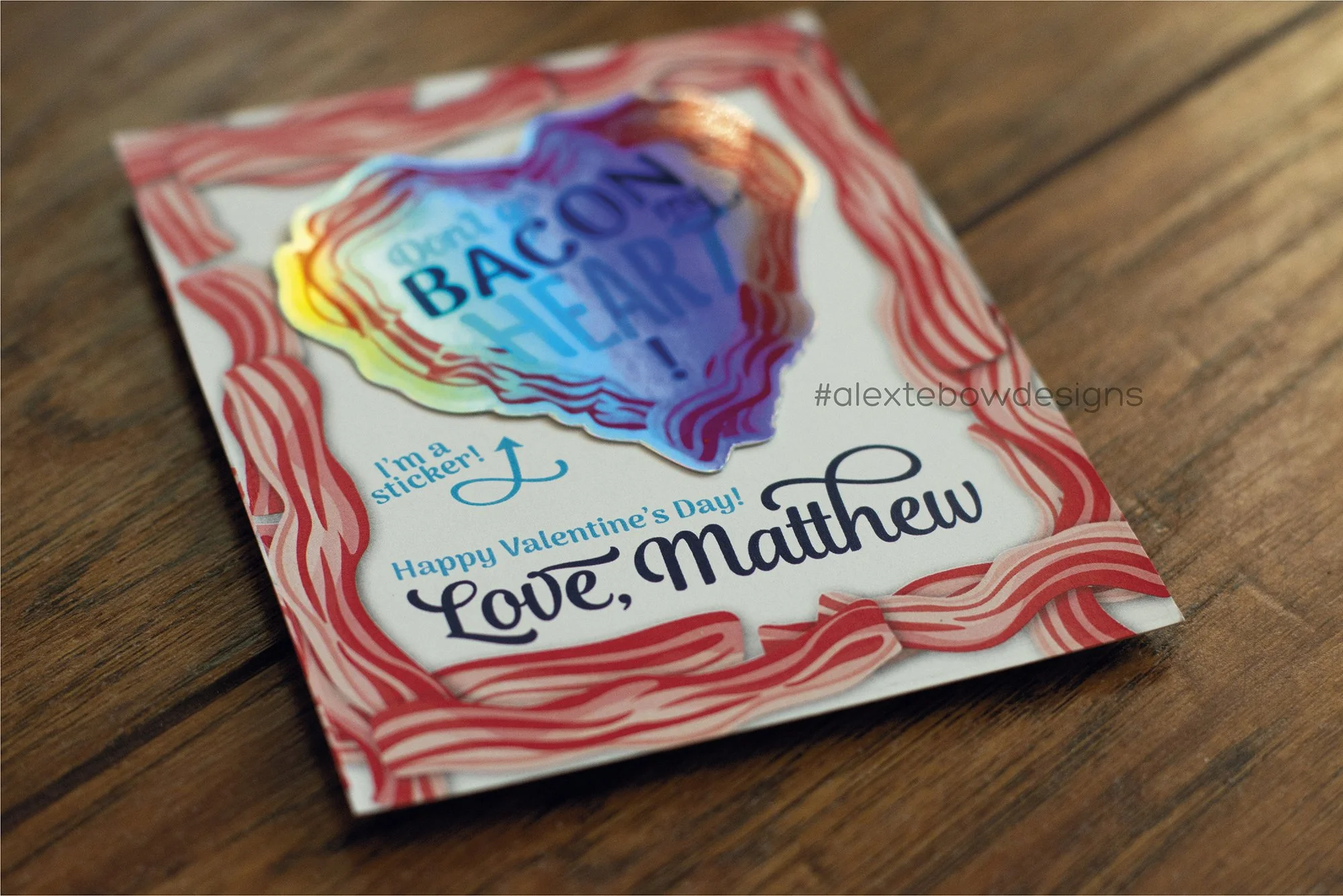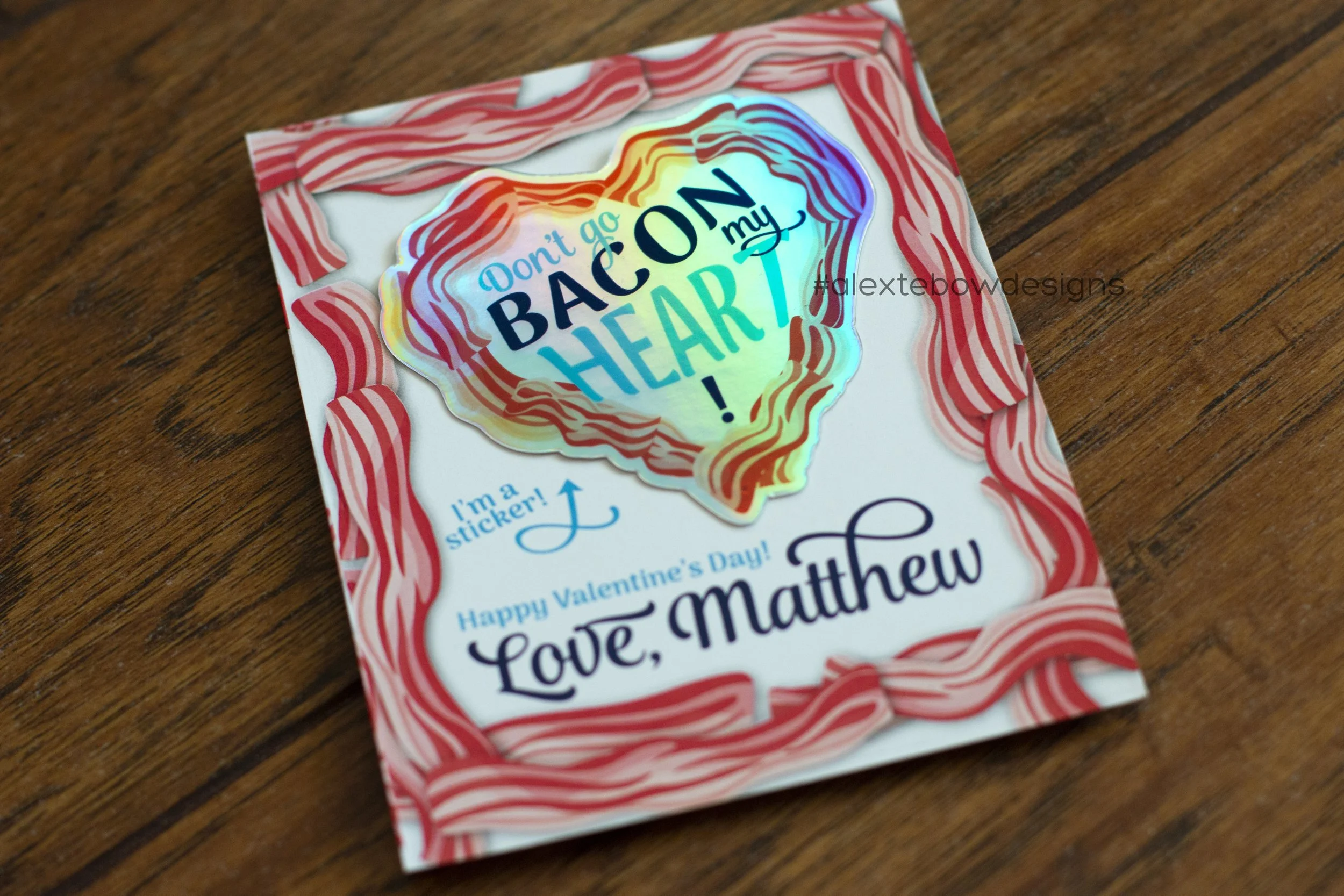 At least my second grader still does valentines! We opted to go with non-food valentines again this year right when Sticker Mule was having a great sale on 3x3 inch holographic stickers. So he and I worked on a quick and fun design and I got them ordered. Have I mentioned that he loves bacon?